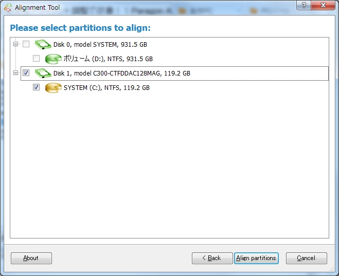 自動的にパーテイションアライメントが最適化されていないパーティションを見つけチェックが付きます、ここではCrucial RealSSD C300 CTFDDAC128MAGが最適化されていないため黄色で表示されチェックが付いています。