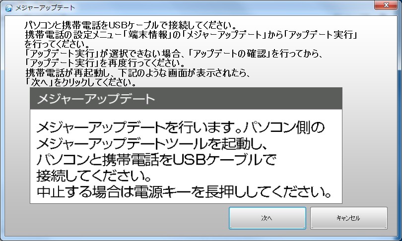 IS03のホームからメニューから設定>端末情報>メジャーアップデートを選択して実行します。