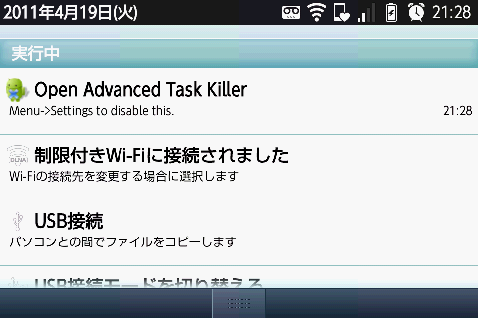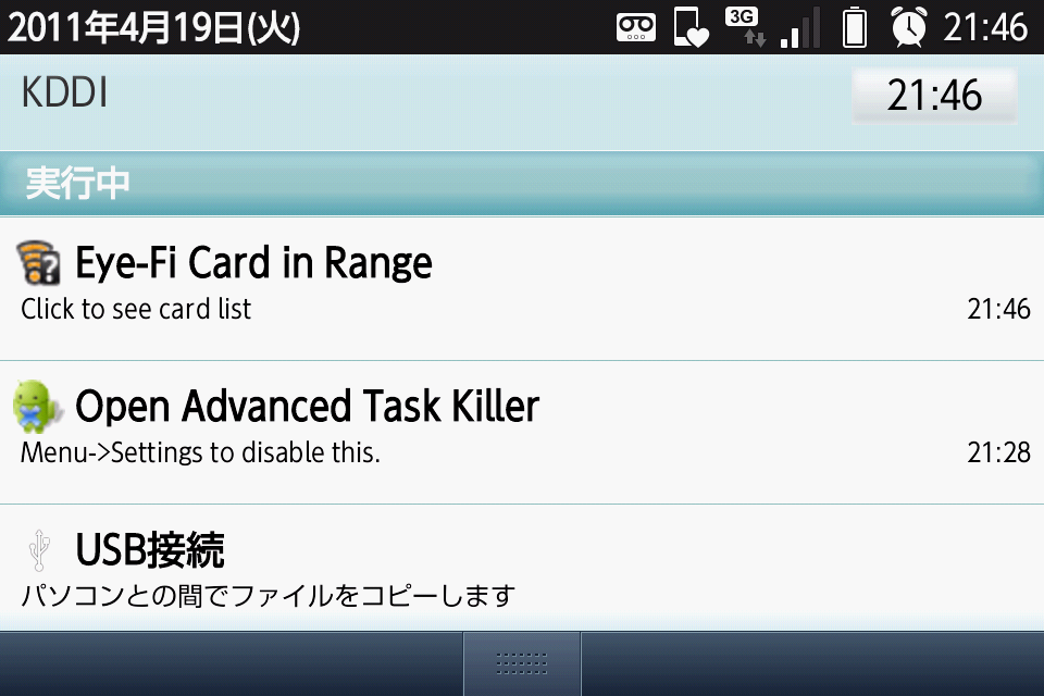 端末のWi-FiをONにしてデジタルカメラのシャッターを切ります、すると「Eye-Fi Card in Range」とお知らせ・ステータスパネルに表示されます、このアイコンをタッチします。