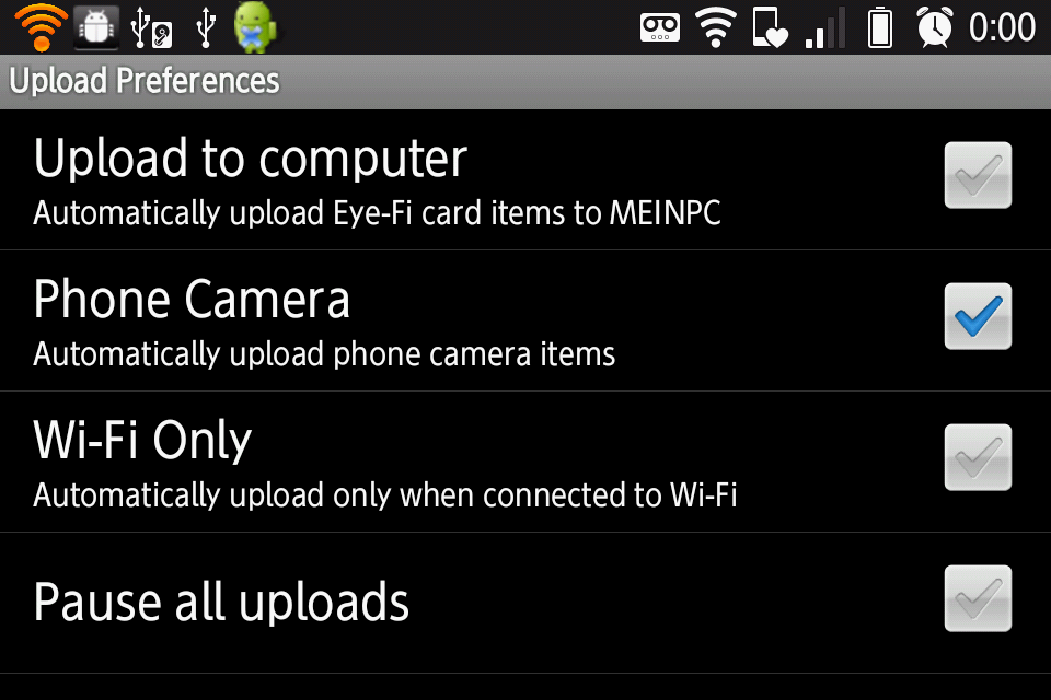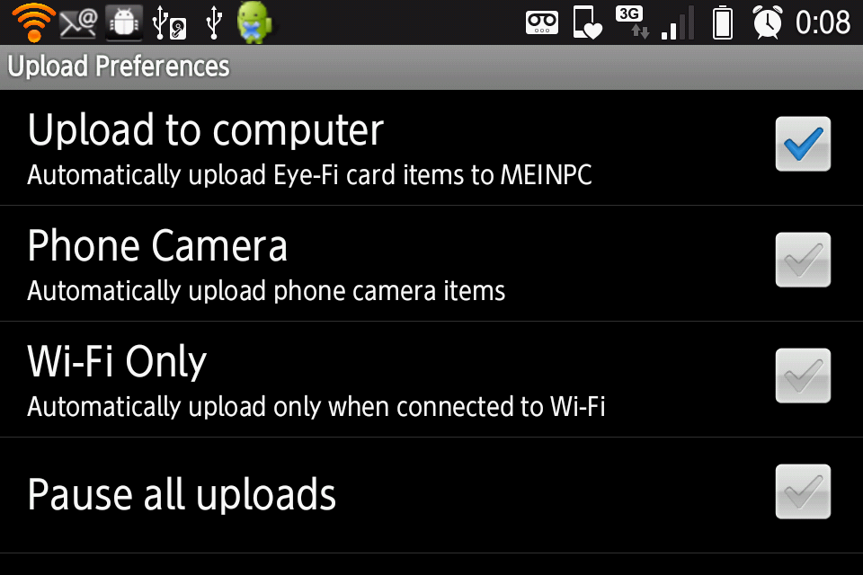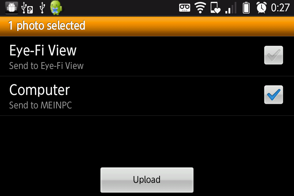 Upload to computerをONするとEye-FiカードからAndroid端末に転送された写真をさらにパソコンへと転送します。