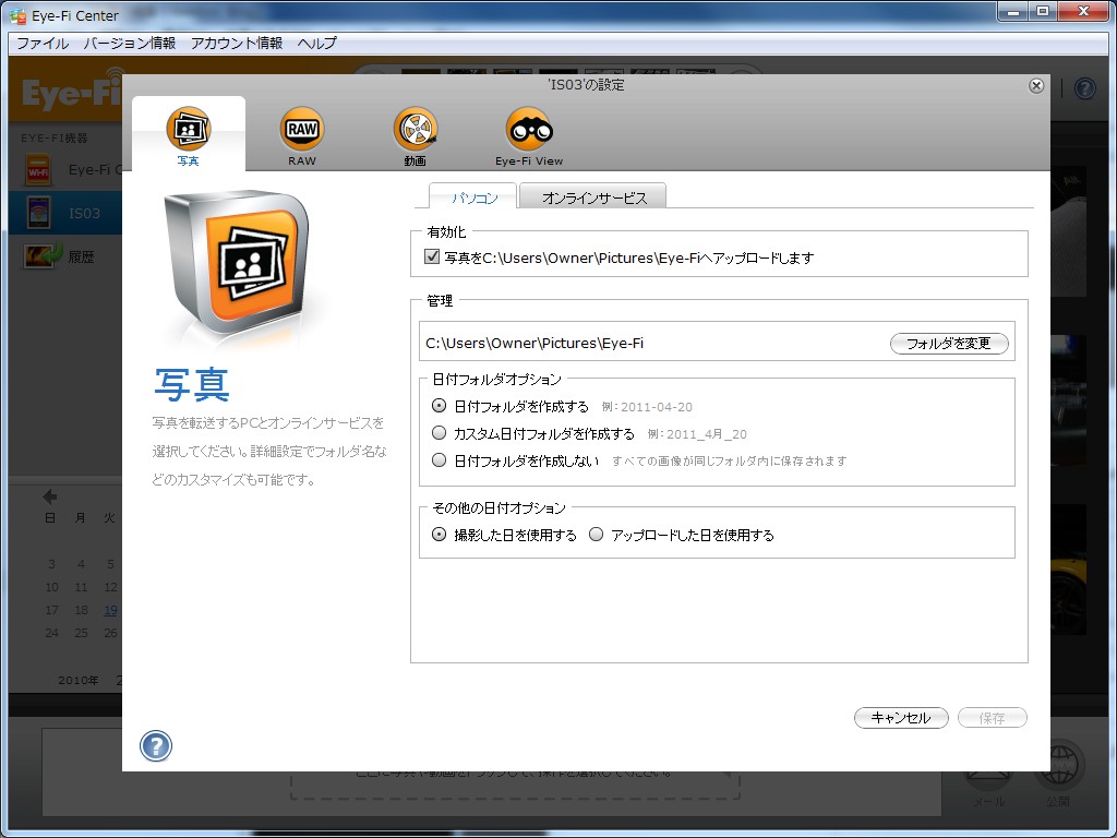 まずはEye-Fi Center側で端末からパソコンに転送するように設定します。