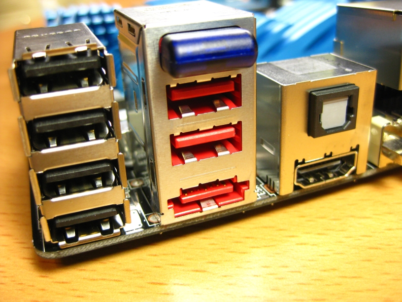 バックのI/OパネルにはUSB2.0コネクタ(黒と赤)x6、Bluetoothドングル(出っ張っている青いモジュール)、eSATAコネクタ、光オーディオ端子、HDMIコネクタ、アナログRGBコネクタ、DVIコネクタ、GigaBit対応LANコネクタ、USB3.0コネクタ(青)x2、オーディオ端子と一通り必要なものはそろっています。