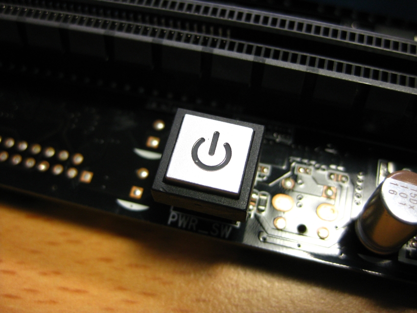ついていてなにげにうれしいのがパワースイッチです、テーブルのうえでえ仮組してテストする場合にはスイッチを別途取り付けていましたがP8Z68-Vにはパワースイッチが搭載されているので助かります。