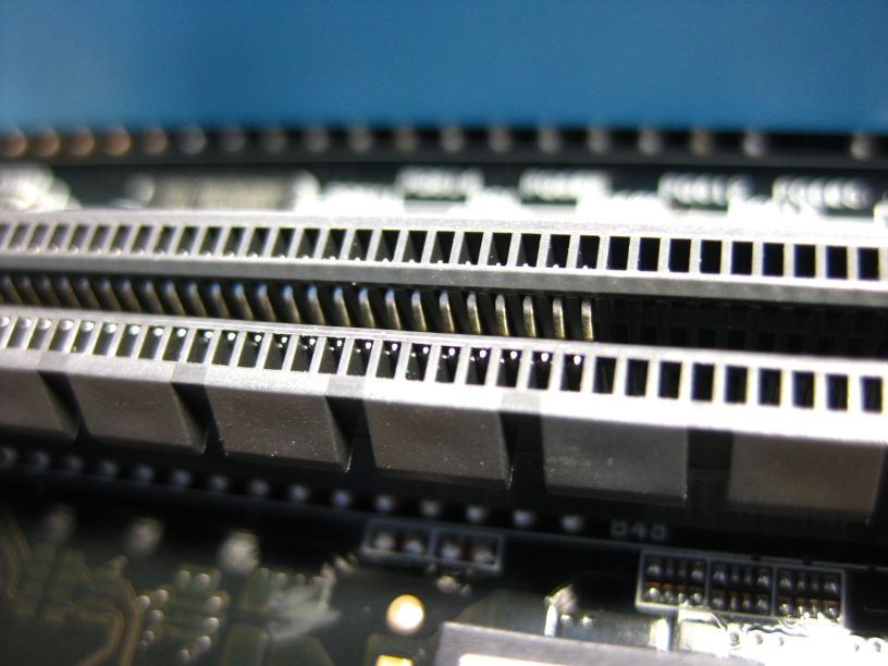 スロットのピンをみてもわかりますが半分までしか実装されていません、これはマルチビデオカード時にPCI Express x16レーンがPCI Express x8で動作するためで不要なピンは実装されていません。