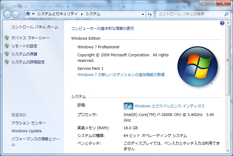 スタート>コントロールパネル>システムとセキュリティ>システムを開きます、コンピューターアイコンを表示しているなら右クリックしてプロパティでもこの画面が出てきます。