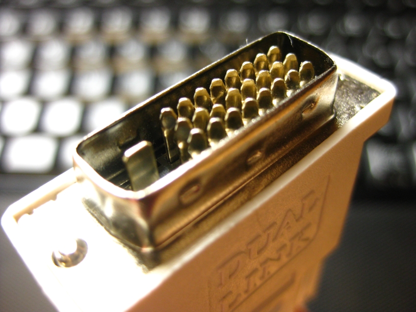 これが付属のデュアルリンクDVIケーブルのコネクタ部分です、ケーブルのピンが通常のシングルリンクケーブルより多いのがみてわかると思います、このケーブルで接続しないと120Hzモニターは性能を発揮できません。