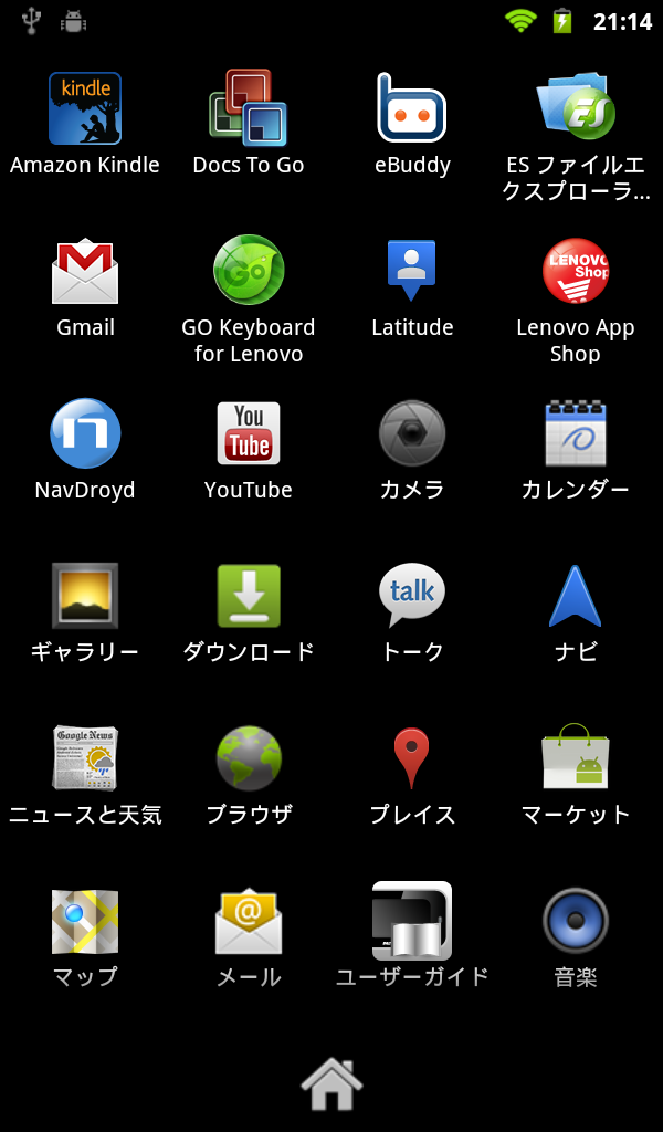 HOME画面の純正ランチャーはウィジェットではなくHOMEアプリ組み込みで固定式とどうしようもないうえ邪魔なのでHOMEアプリでHOME画面を変更したほうが使いやすくていいでしょう、これについては後日Lenovo IdeaPad Tablet A1のお勧め設定記事を公開したいと思いますのでその中で変更方法について書いていこうと思います。