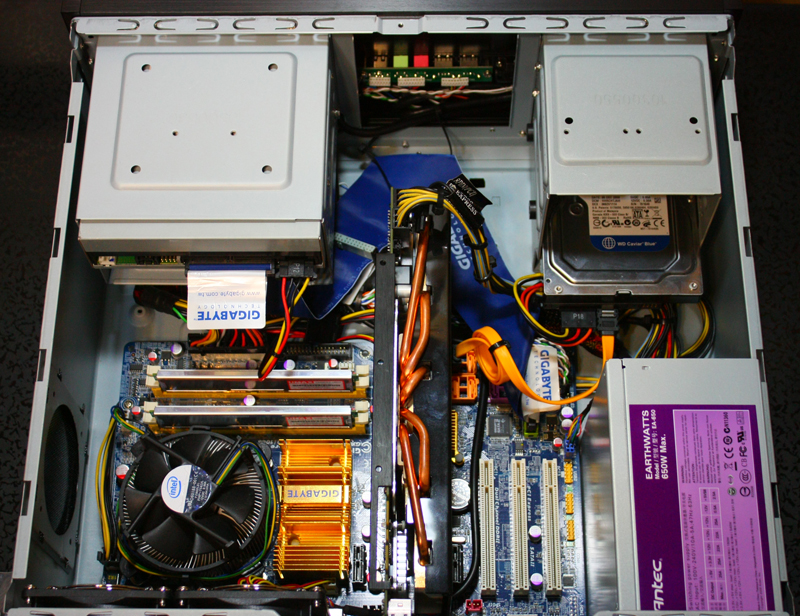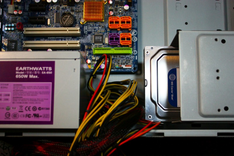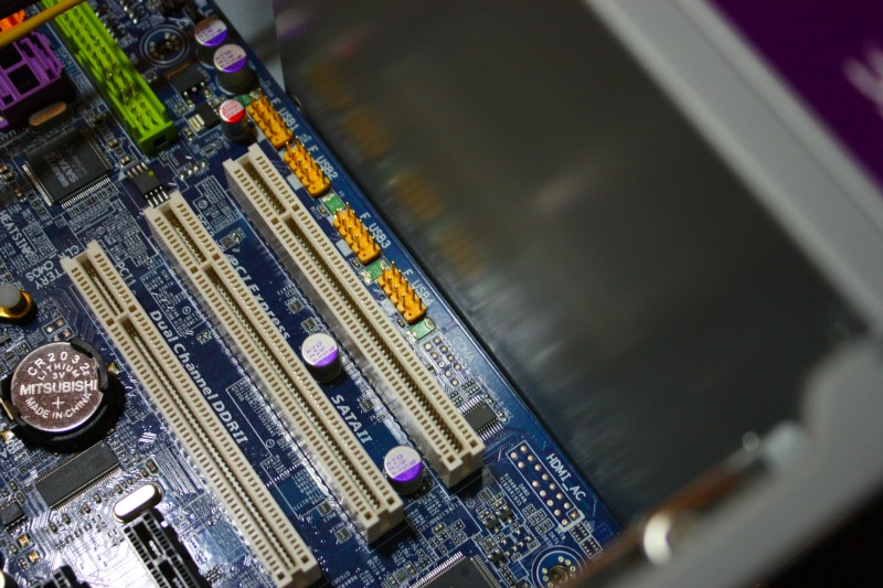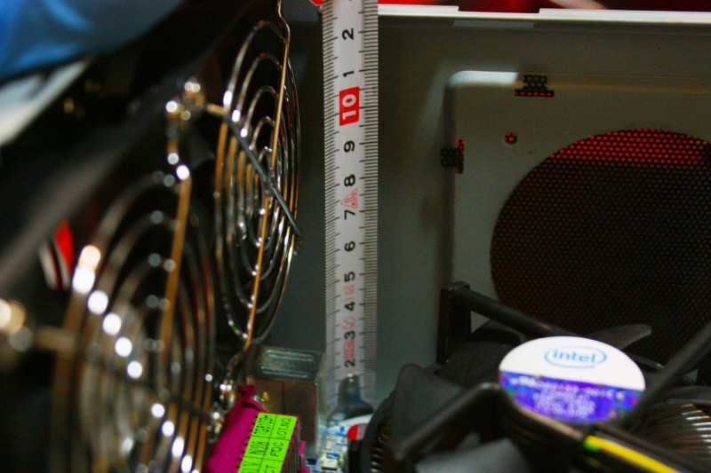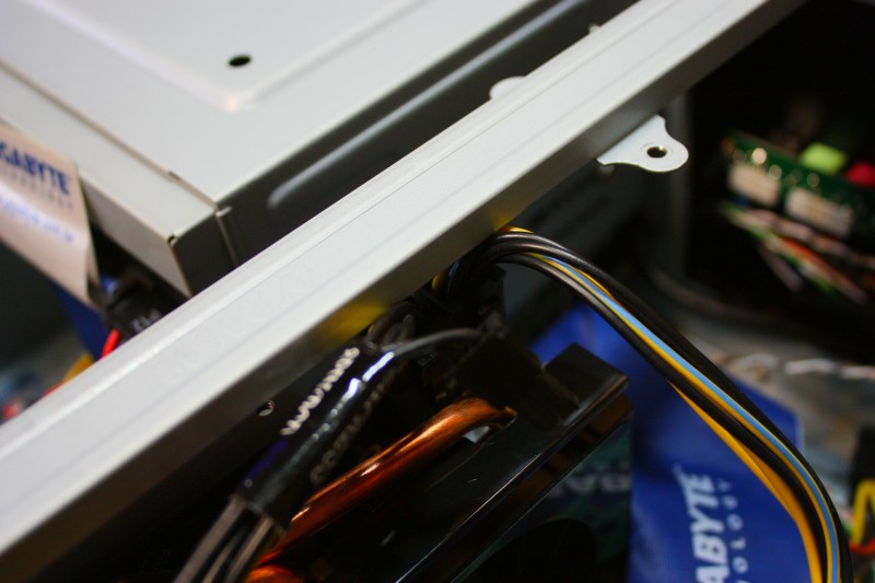 電源とマザーボードの間は1cmもありません、使用しているマザーボードはGA-P35-DS3Rで電源はEA-650になります。