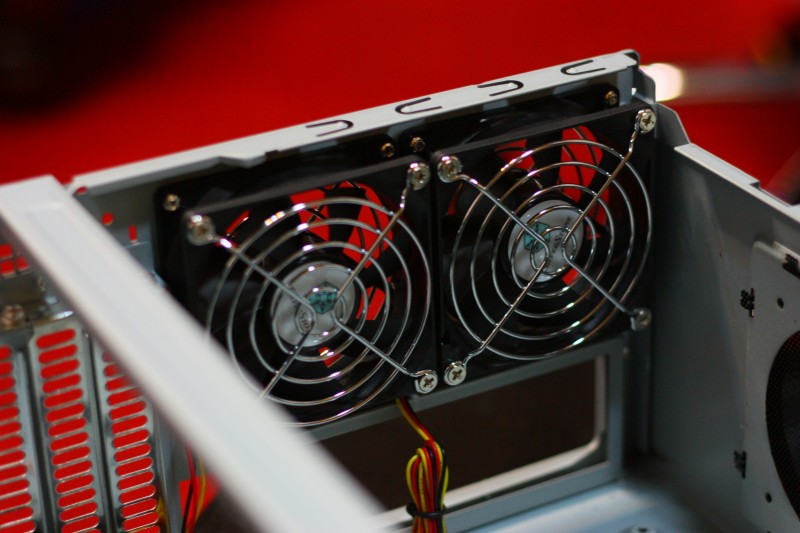 ケースの右はCPU用、左は電源の吸気用、フロントからの吸気口はフロントパネルの下にあり排気は80mmのケースファンを2基使用して吐き出します。