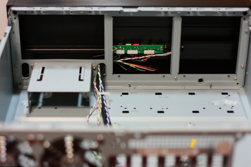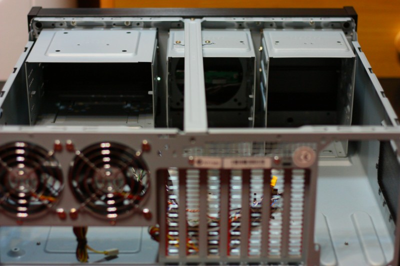 ケース内部をリアからフロントにかけて撮影したものです、フロントのベイはユニット構造になっていて取り外すことが可能です。
