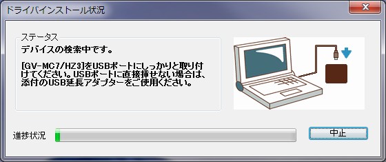 この画面が出て初めてGV-MC7/HZ3をパソコンと接続します、接続後自動的にハードが検索されドライバーがインストールされます。