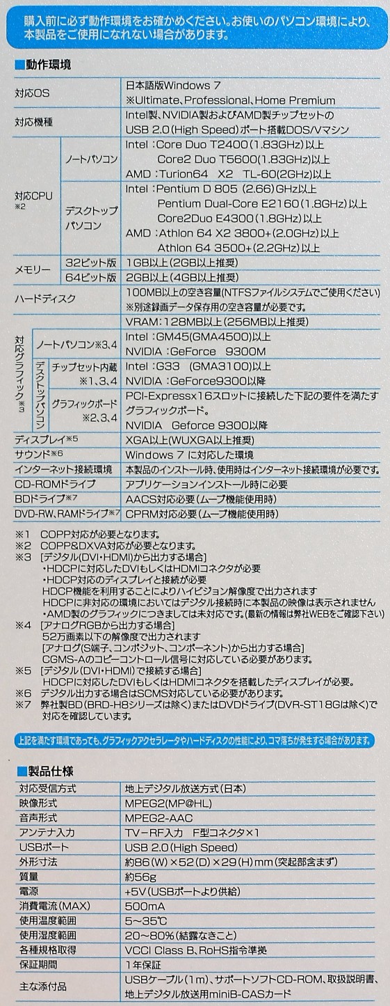 対応OSはWindow 7のHome Premium・Professional・Ultimateの32bit・64bit両対応ですが地上デジタルTV放送は1080pという高解像度の映像を再生するために高い処理性能を求められるためOSが対応しているからといっても再生が保証されるわけではありません。