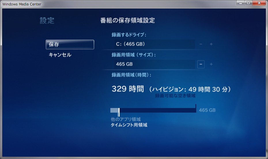 設定はWindowsMediaCenterの画面からタスク>設定>テレビ>録画機能>番組の保存領域設定>で上記の画面になるので「録画するドライブ」を追加したHDDに変更するだけです、ただし録画したデータの入ったHDDを他のパソコンに接続しても著作権保護機能により録画データは再生できません。