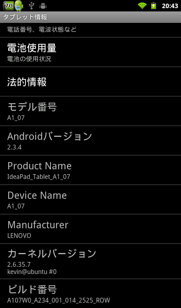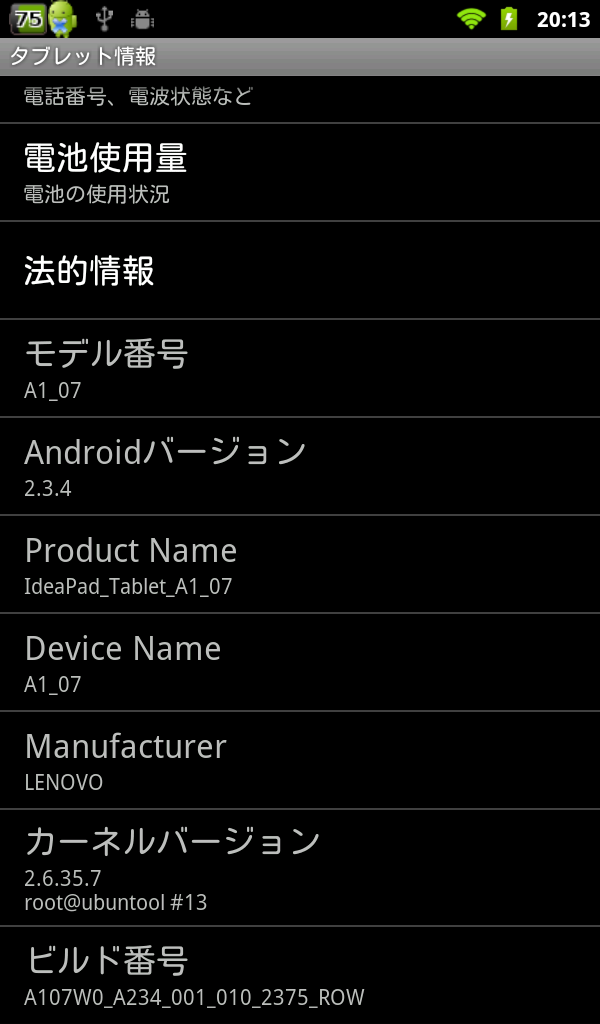 Lenovo IdeaPad Tablet A1がアップデートしました、日本語フォントに対応するとの噂もあるのですが今回のA107W0_A234_001_014_2525では残念ながら従来と同じく中華フォントでした。