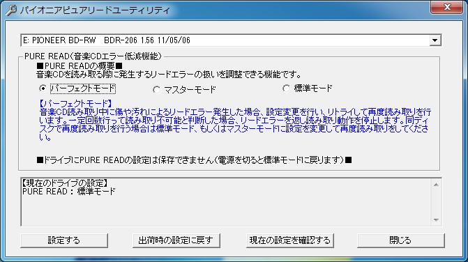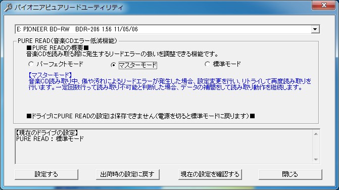 これらのソフトとは別にドライブの制御を設定するパイオニアピュアリードユーティリティというものがあります、このソフトはドライブを通常の標準モードからマスターモードとパーフェクトモードへと移行することが可能です。