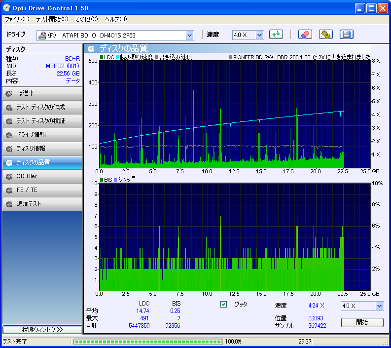 つぎにBDR-206JBKです、エラーレートの傾向は似ているもののほんの僅かながらSW-5584に記録品質は及ばずといったところです。