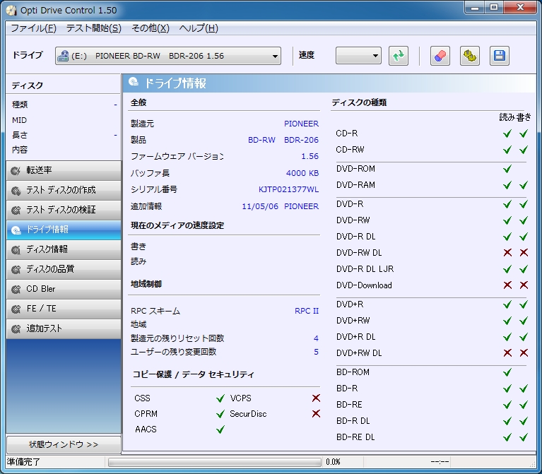 Opti Drive ControlによりBDR-206JBKでテストディスクを作成