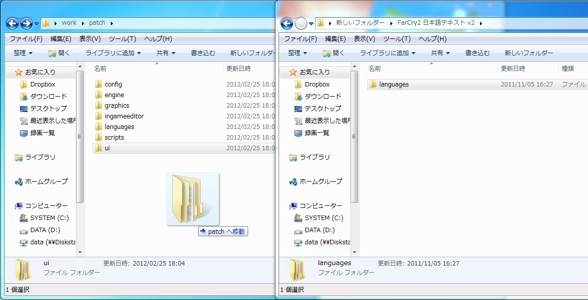 FarCry2 日本語テキスト v2の中にあるlanguagesフォルダも同じようにドラッグアンドドロップしてフォルダを上書きします。