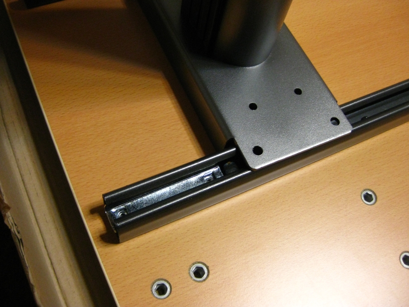 脚の取付はレールに金具をはめて6角レンチで締め上げるだけです。レールの好きなところで固定できるので足下の隙間を調整することができます。