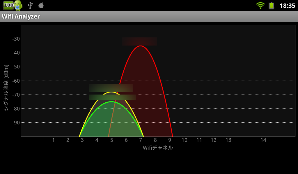 この画像は無線LANの状態を確認することが出来るWifi AnalyzerというAndroidアプリ(Windowsにも似たようなinSSIDerというアプリがある、無線LANの速度が遅い、繋がらないときはこれで確認してみるといい)で無線LANの電波環境を表示したものです。高さは電波強度を表し、横幅は周波数を表していますが右の赤い無線LANルーターのチャンネルは7に設定しているにも関わらず4チャンネル後半から9チャンネル前半まで使用していることが分かります。