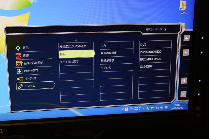 念のためモニター側で120Hzで駆動しているか確認しておきましょう、OSDからシステム>情報でモニターのリフレッシュレートを確認することができます。写真のように現在の解像度の最後が@120となっていれば120Hzで駆動しています。