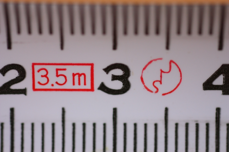 MACRO 50mmF2.8 EX DGはインナーフォーカスではないため、被写体との距離に応じて胴体が飛び出てきます。レンズにも書いてありますが1:1の等倍時はここまでサイズが長くなります。最短撮影距離は0.188mでレンズフードを付けた時点で17cm(EOS KISS X2の場合)あるためレンズフードと被写体との距離は2cmを切ります。等倍で撮影しようとするなら被写体との接触に気を使わないといけません。