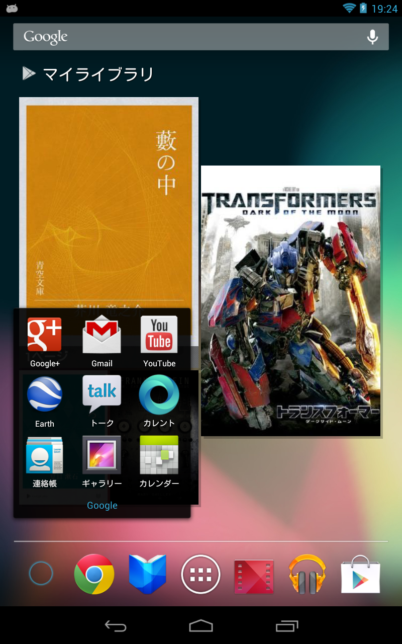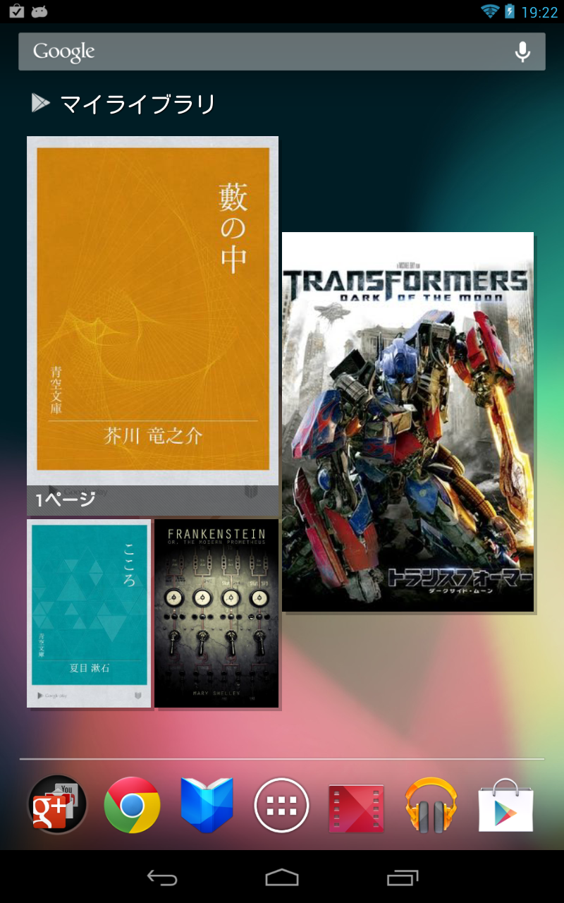 初期状態のHOMEでは、デカデカとマイライブラリのウジェットが表示されています。どうもコンテンツが特典で付いているようで、トランスフォーマー ダークオブザムーンや英語版のフランケンシュタイン等が付いてきます。