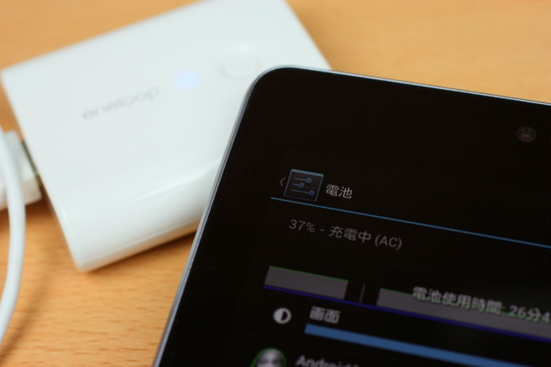 試しにバッテリーが尽きるまで使用し、電源が切れた状態のNexus 7をモバイルブースターKBC-L2B(3.7V5000mAh)で充電してみたところ21%66%(怪しいので再検証しました)まで充電ができました。これでは少し物足りないので、もっと大容量の外部バッテリーが欲しくなるところです。