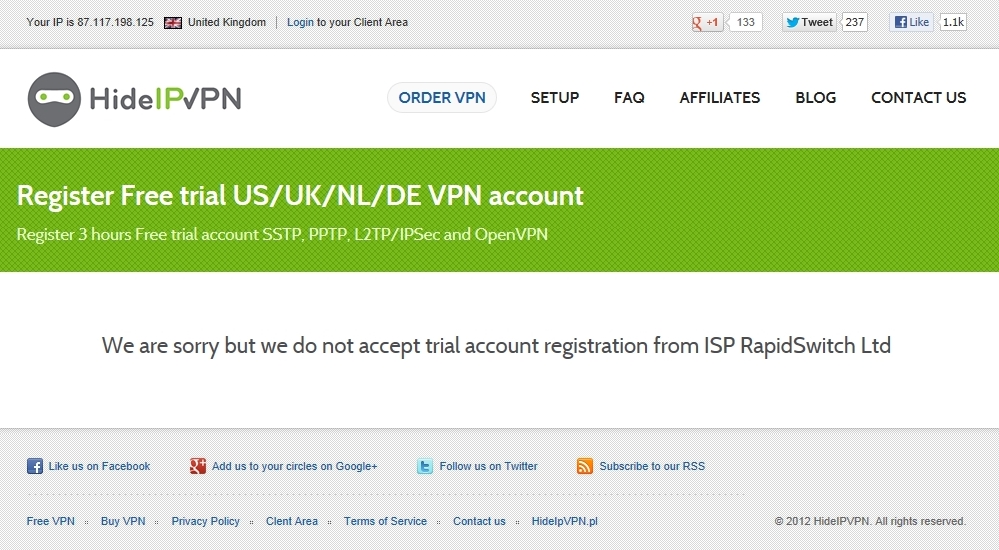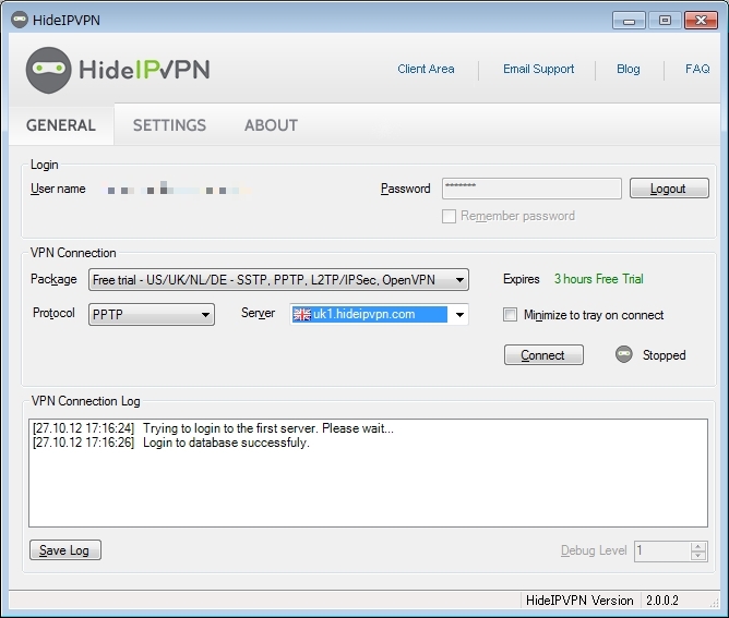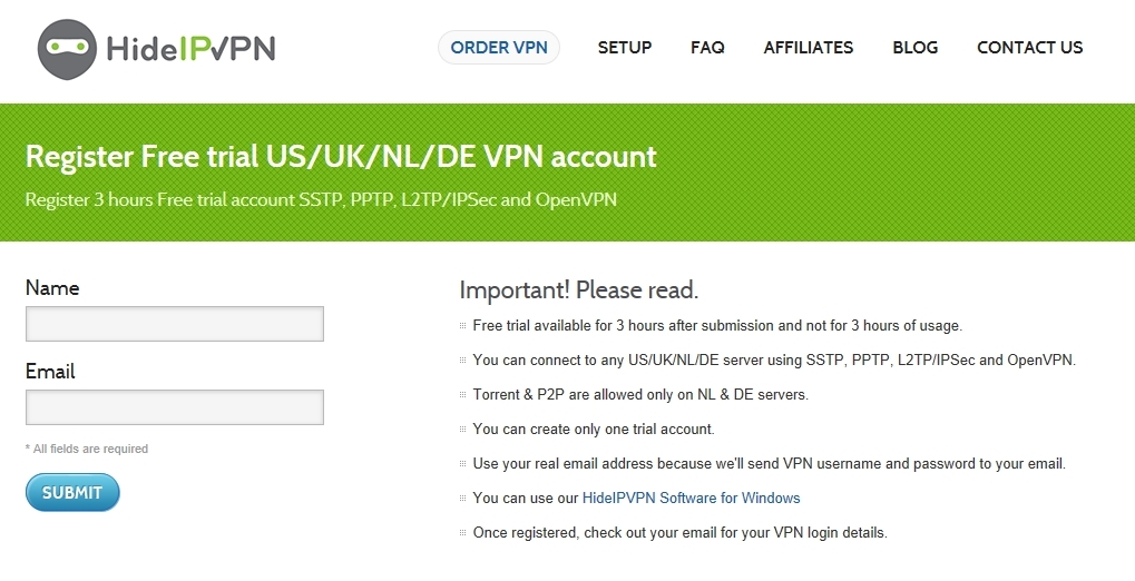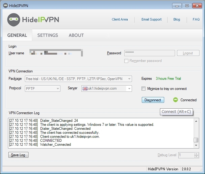 そこで今回使ったのがHideIP VPNというサービスです。本来有料ですが3時間フリーで使えるのでその間に登録をすませればOKです。