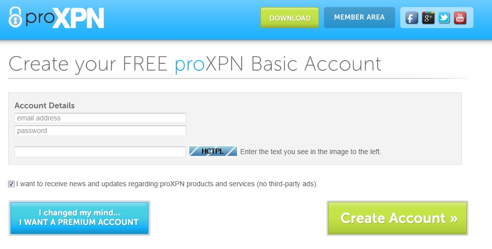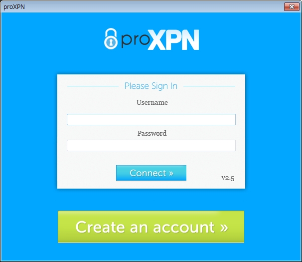 proXPNアプリが立ち上がった状態です。下部のCreate an accountをクリックしてユーザー登録に移ります。