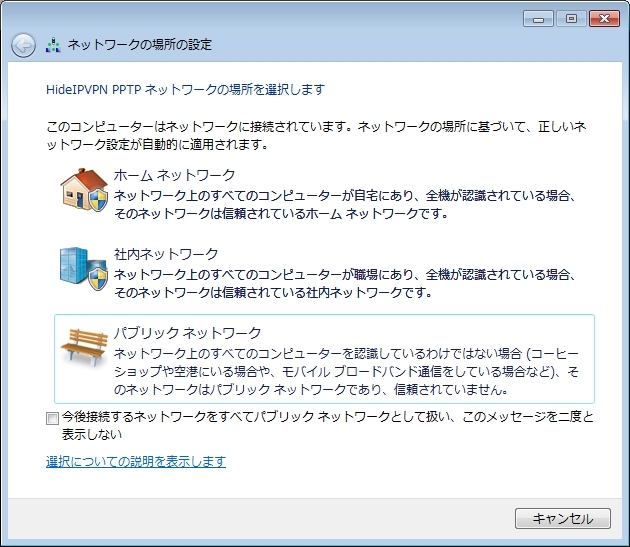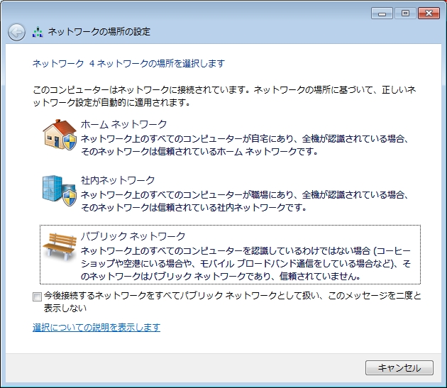 接続するとネットワークの設定画面が出てくると思いますが、必ずパブリックネットワークを選択してください。