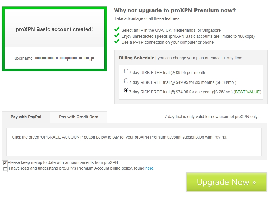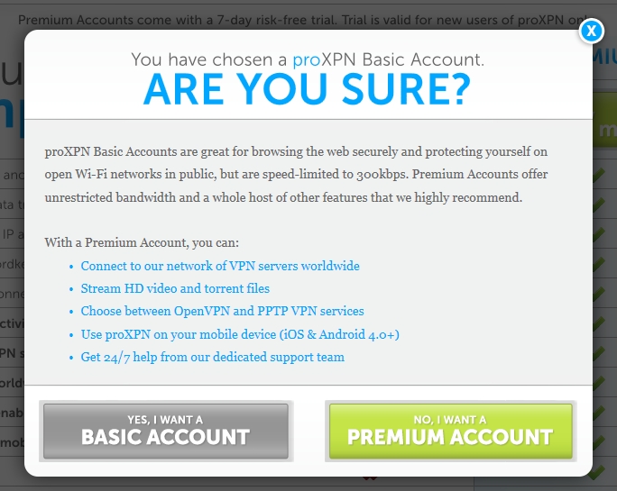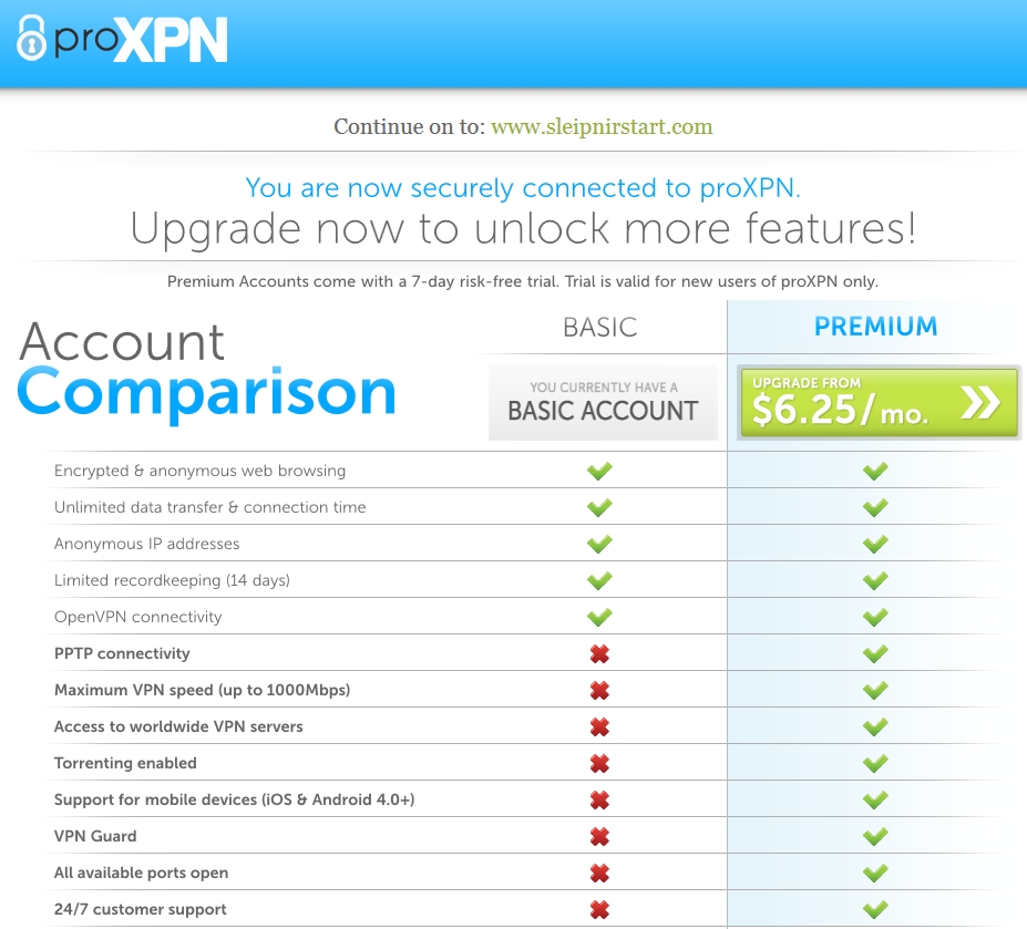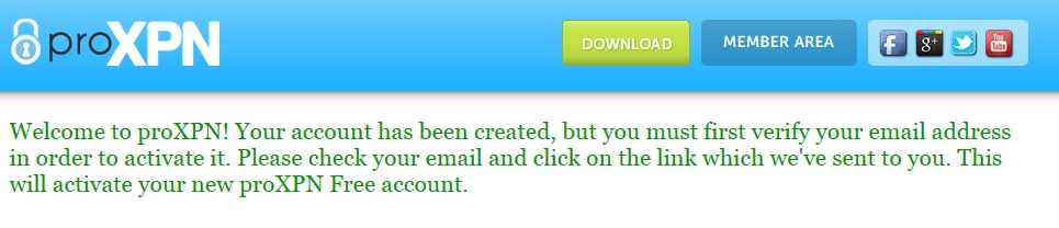 ブラウザでアクチベーションが完了してアカウントが正式に登録された旨が表示されます。有料のアカウントにしないか書いてありますが、無視してproXPNアプリに戻ります。