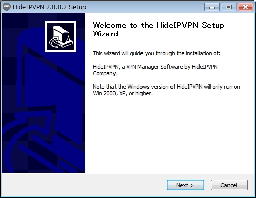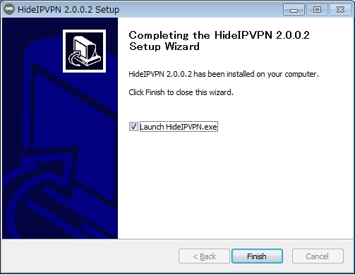 これでソフトのインストールは完了です。FinishをクリックしてHideIPVPNを立ち上げます。