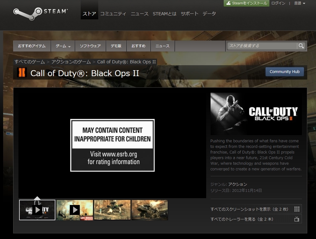 試しにSteamのCall of Duty:Black Ops IIのページを開くとしっかりと表示されました。国内からだとおま国ページなります。なお、そのまま購入できるかもしれませんがアカウントがバンされるように規約が改定されましたので購入は覚悟のうえ自己責任でどうぞ。