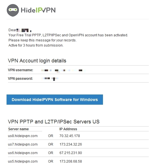 先ほど登録したメール宛に登録完了の内容とソフトのダウンロード先が表示されますので、Download HideIPVPN Software for Windowsをクリックしてソフトをダウンロードします。