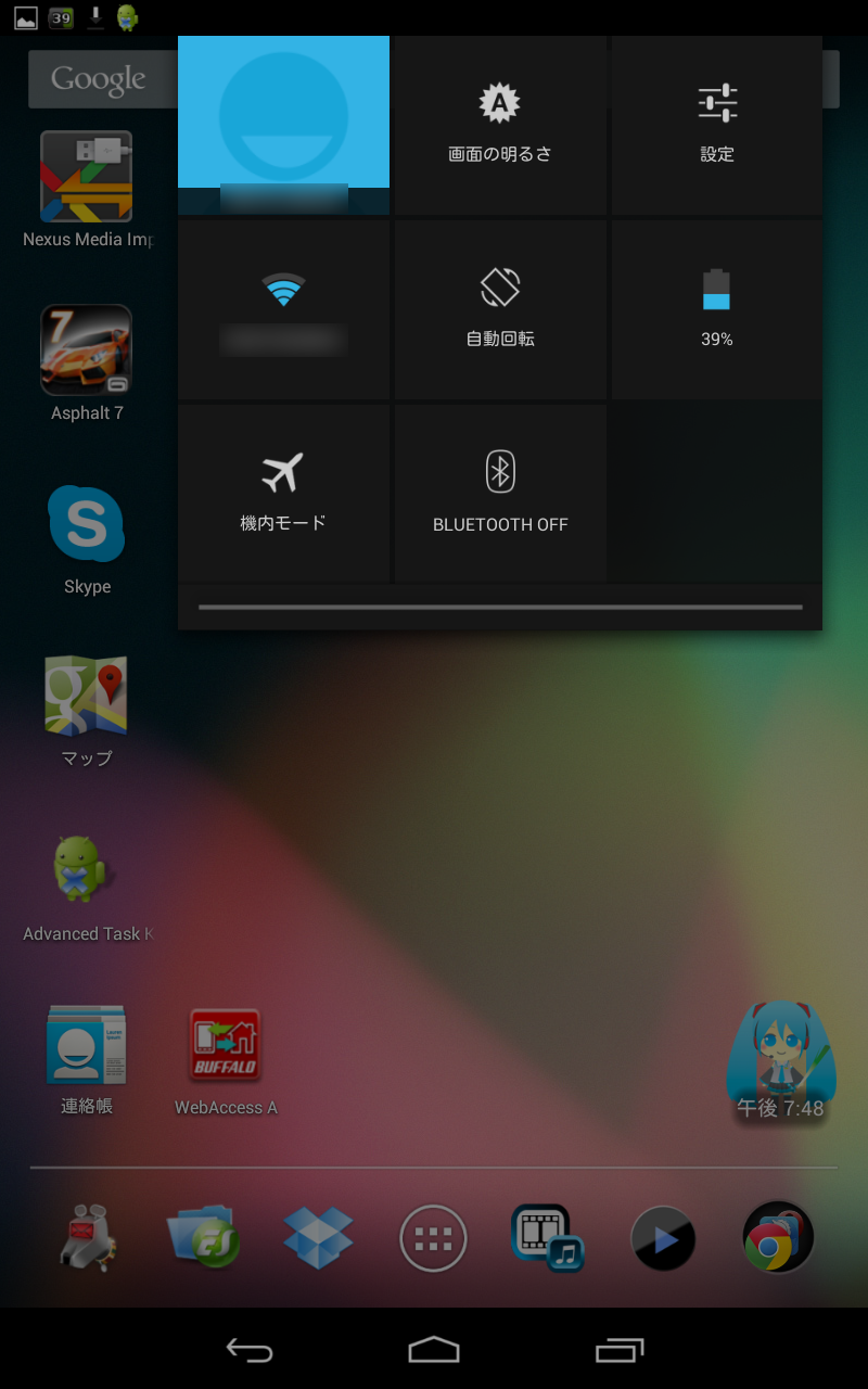 画面上右側を下にフリックすると機能のON/OFF画面と、新しく追加されたマルチユーザー機能(Quick Setting機能)によりユーザーアカウントの切替えアイコンが表示されます。