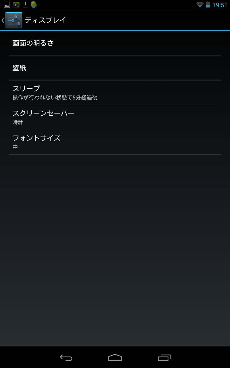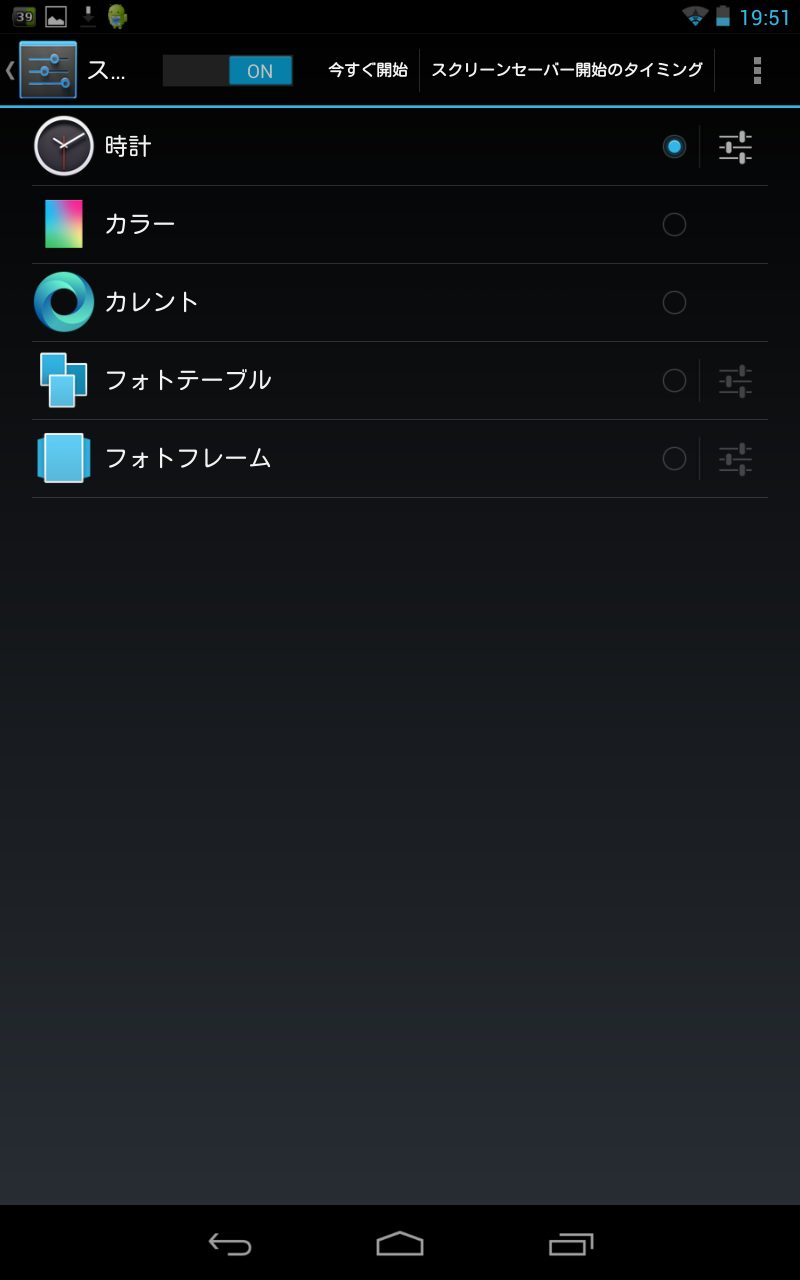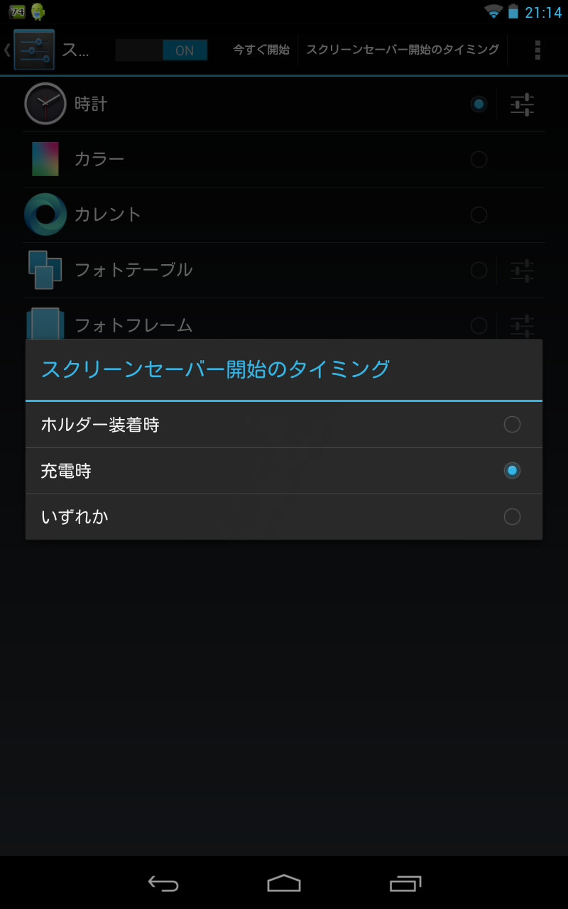 ただ、PCと違いバッテリーで動くため、無闇にスクリーンセイバーを起動するぐらいならスリープに切り替った方がいいのは当然ですので、スクリーンセイバー開始のタイミングはドックに差込んだときと充電時、もしくはその両方のみとなっています。