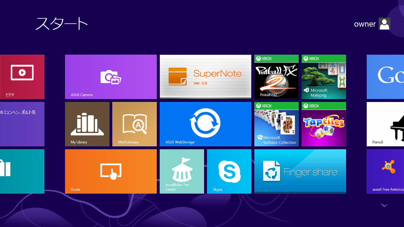 ASUS VivoTab Smart ME400Cに搭載されているOSは無印のWindows 8になります。起動したらWindows 8の顔といってもいい、あのModernUI(旧MetroUI)が表示されます。