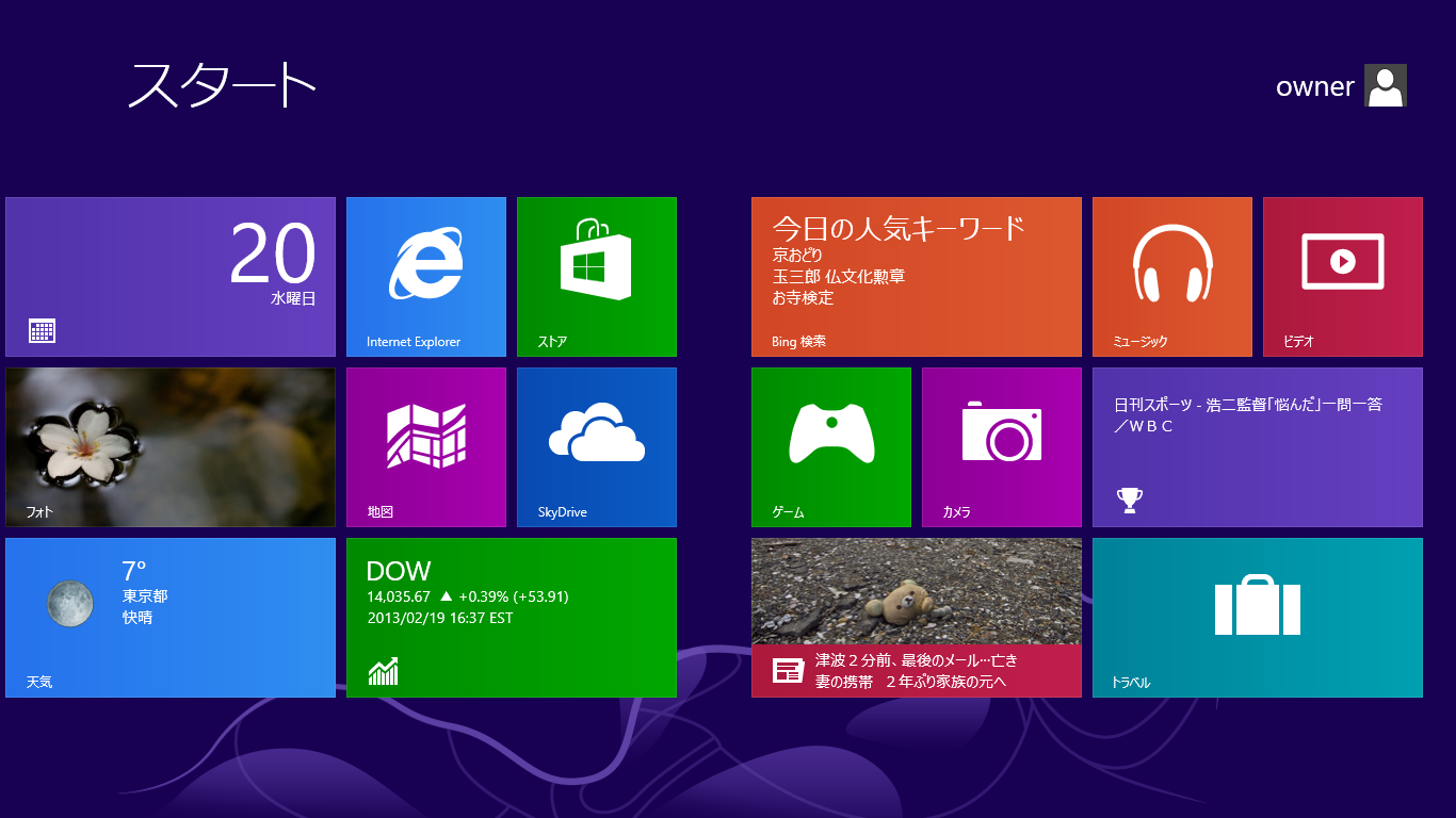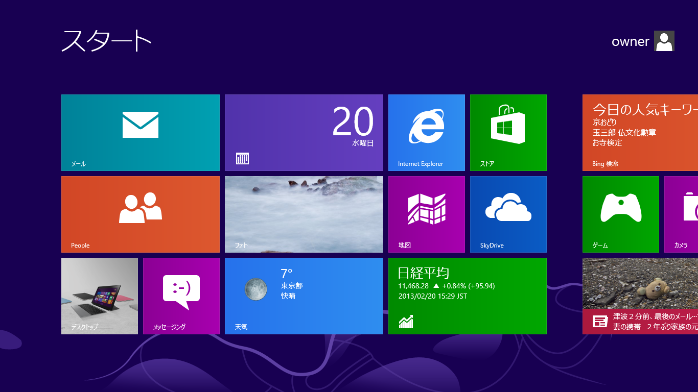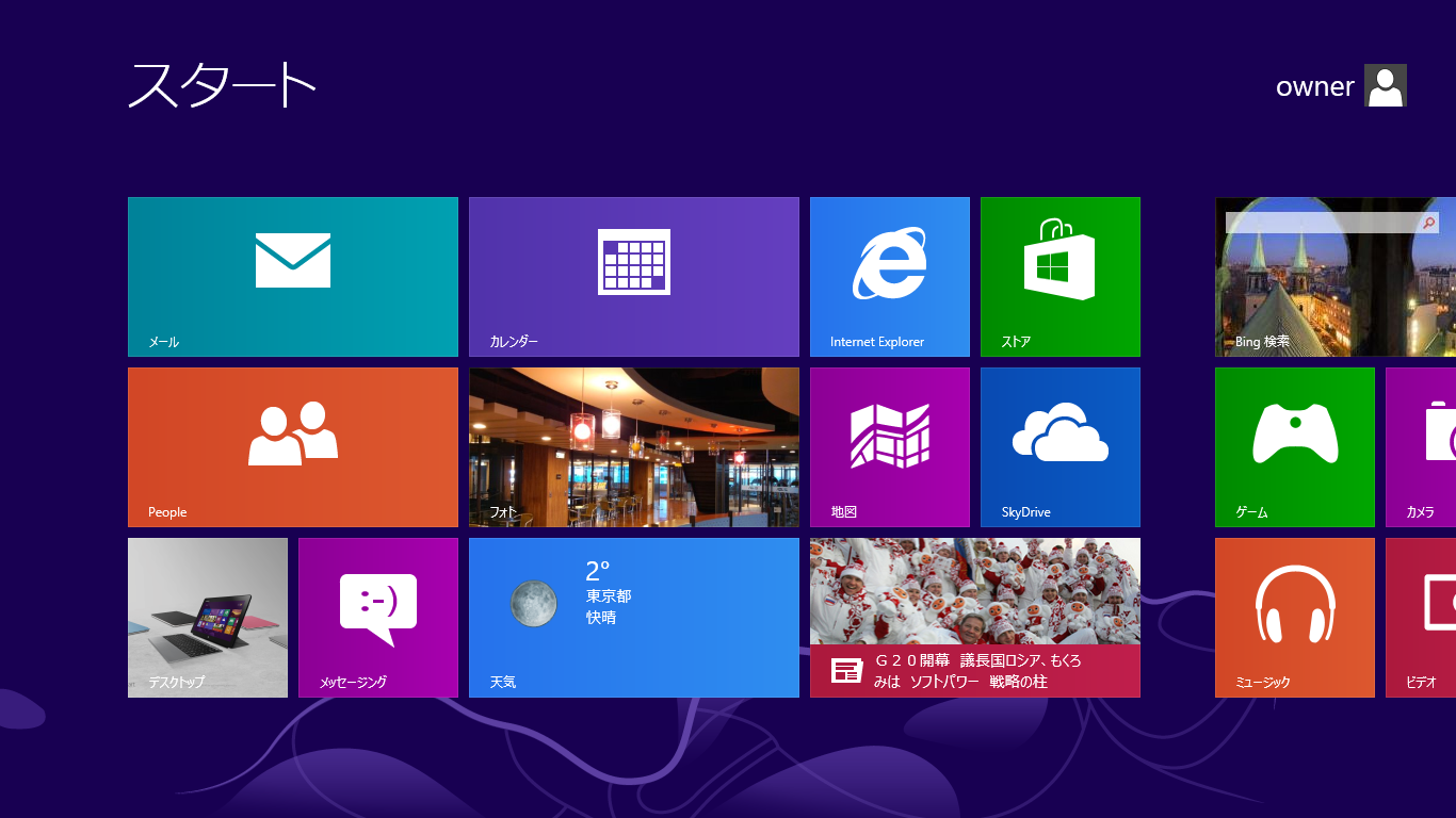 初期状態のModernUIではMicrosoftのWebサービスBingのニュースやカレンダー、株価情報などのビジネス系アプリ。