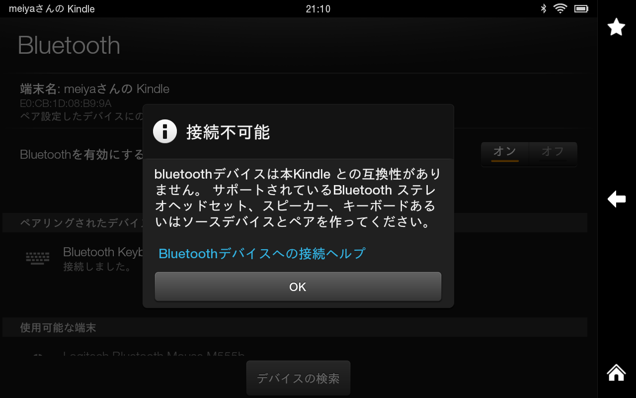 ペアリング設定すると接続不可能とメッセージが表示され、マウスが使えないことを通知されます。