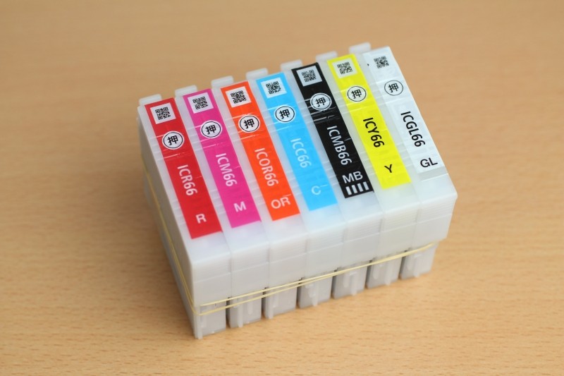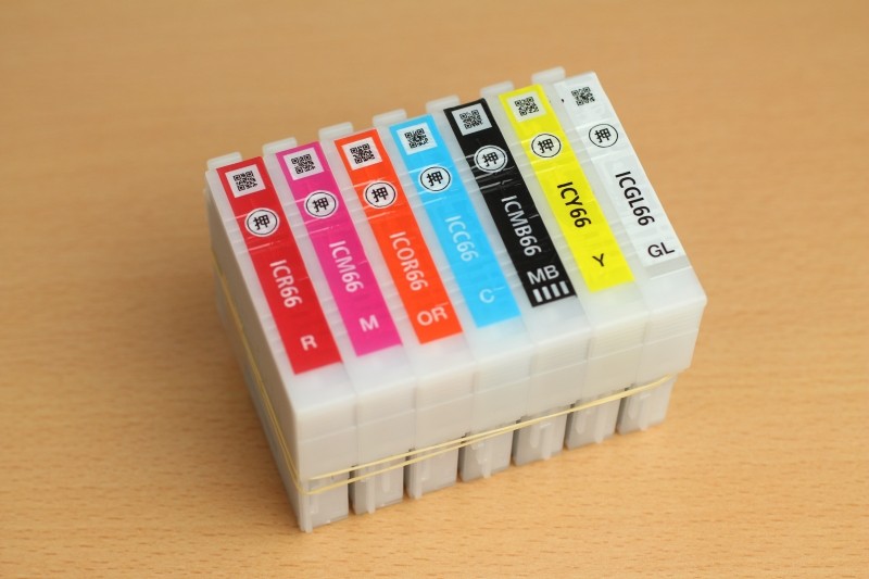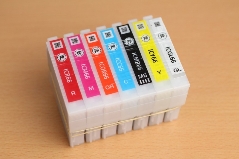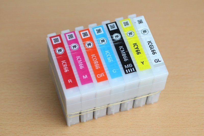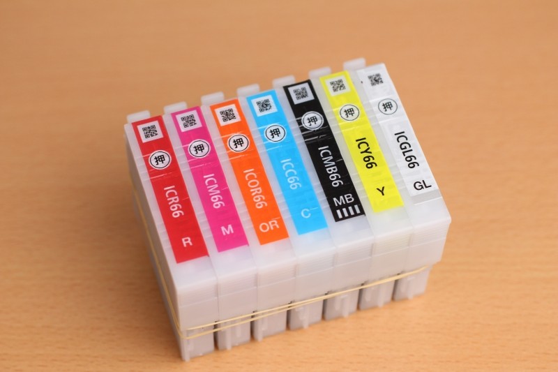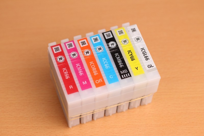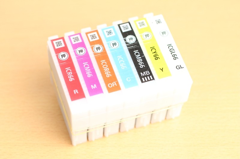 次にインクカートリッジを並べたものを撮影してみました。カラフルなカートリッジですが、意外にも差はほとんど見受けられません。