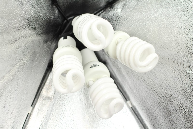 しかし、電球形蛍光灯は全光束が高い電球が手に入りやすいので(1650lmで1000円程度、地方のホームセンタにもあるほど)重宝しています。撮影時には電球150WクラスのF32W-Tを照明機材に4灯つけ、1つの照明が6600lmの明るさを発します。