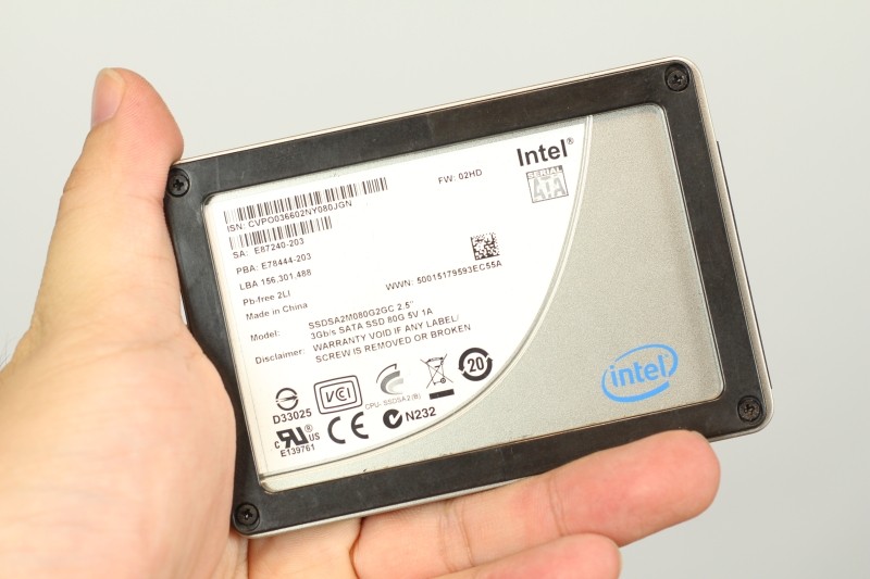 ストレージは夏に壊れて稼働していない車載PCから取り出したIntelのSSDSA2M080G2GC 2.5を使います。消費電力的にSSDや2.5インチHDDは有利になります。