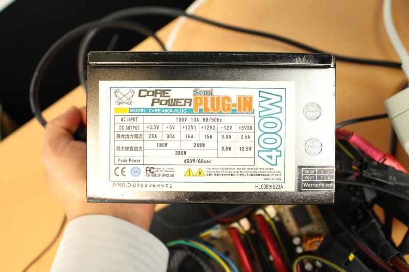 電源は400Wで、ビデオカードを同時に2枚、しかもフルロードさせるには12Vの容量が心許ないのですが、ドライブ類を取っ払っているおかげか、何とか動いています。