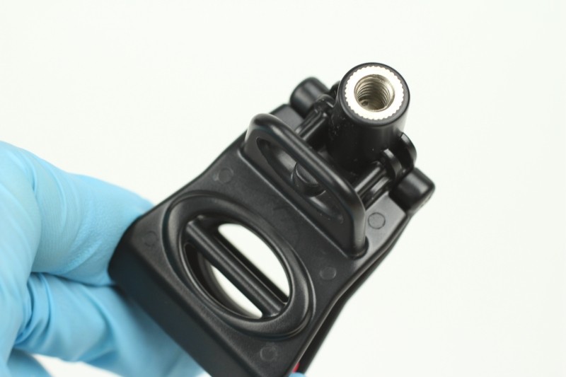 三脚への固定にはネジを使います。底に三脚の標準規格ネジ1/4-20UNC用のネジ穴があるので、三脚の雄ネジで固定するだけです。