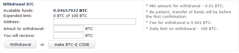 BTCeのメタトレーダー口座からの出金(通常のBTCeの口座に対して出金)は入金と同じページから可能ですが、平日のみ対応で出金は最大24時間の時間がかかります(通常数十分で可能)。