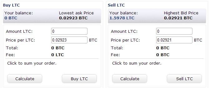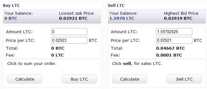 入金が完了したらトレードの画面を開き、LTC/BTCを選択。表示されたページのSell LTCのエリアにあるAmount LTCに売りたい数量を入れ、Price Per LTCに売値を入れてCalculateをクリックします。