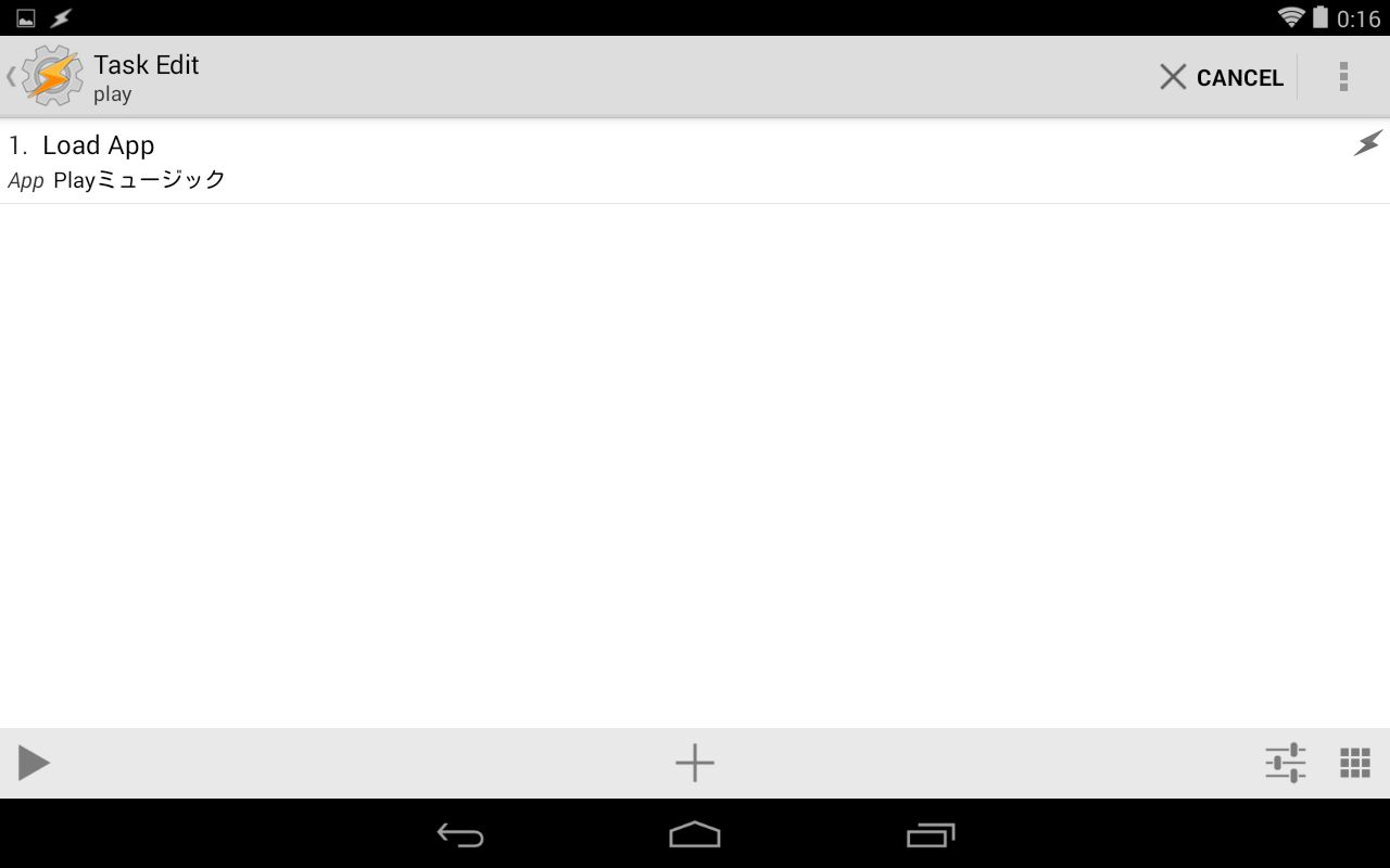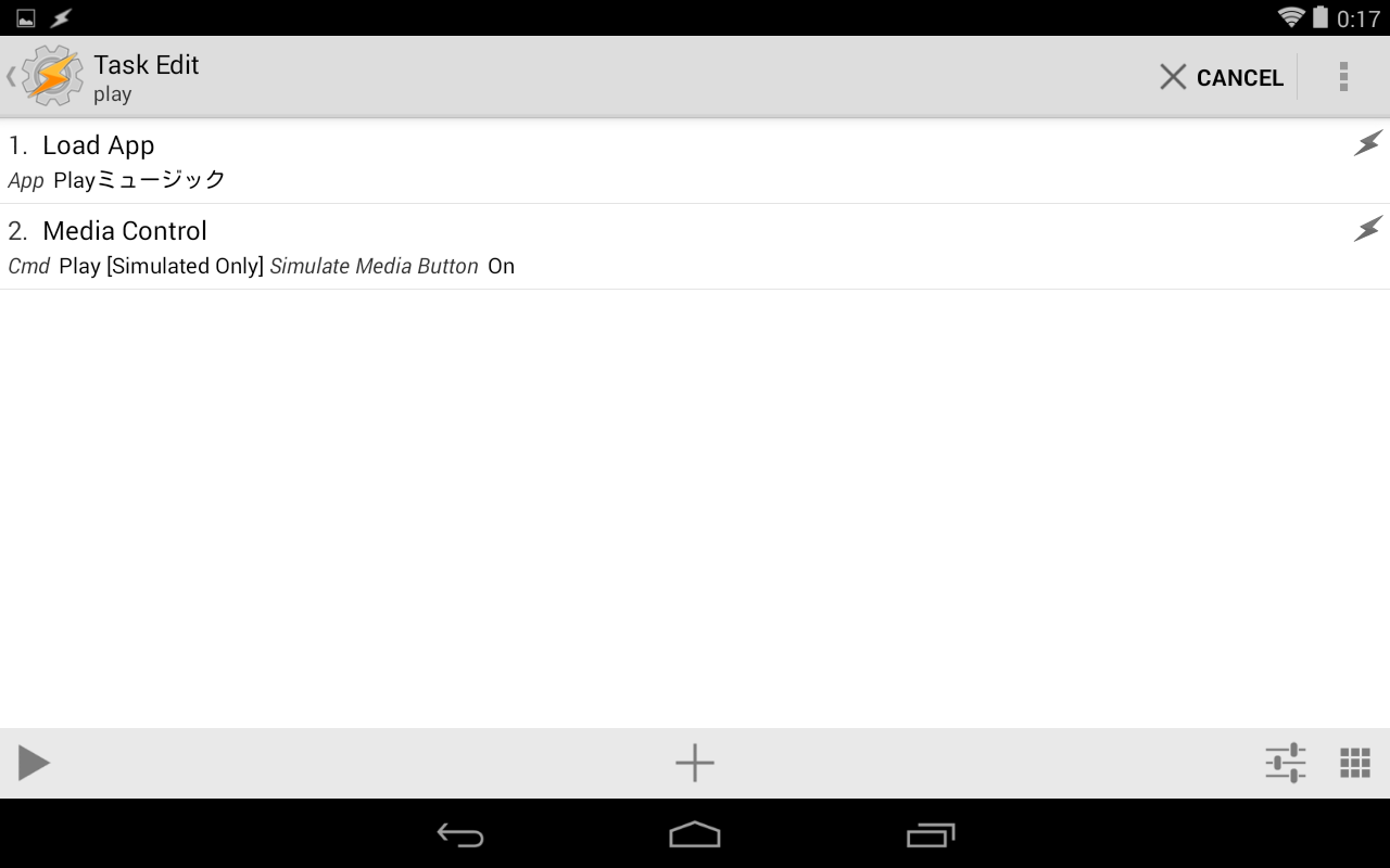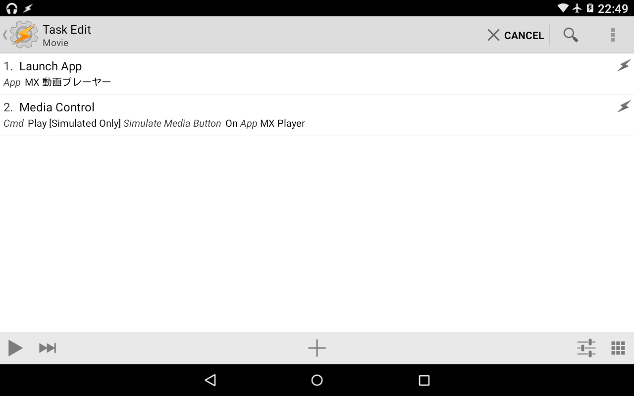 この画面に切り替ったらcmdをPlay[simulated Only]にし、Taskerアイコンをタッチしてタクス設定の初期画面に戻ります。