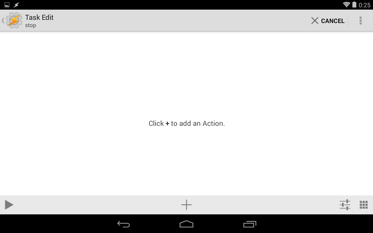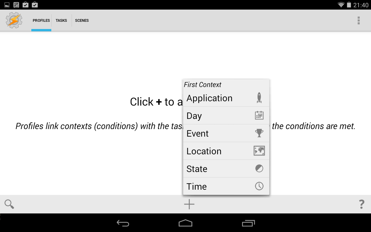 Taskerを立ち上げたところです。シンプルなGUIですが強力なタスク設定ができます。