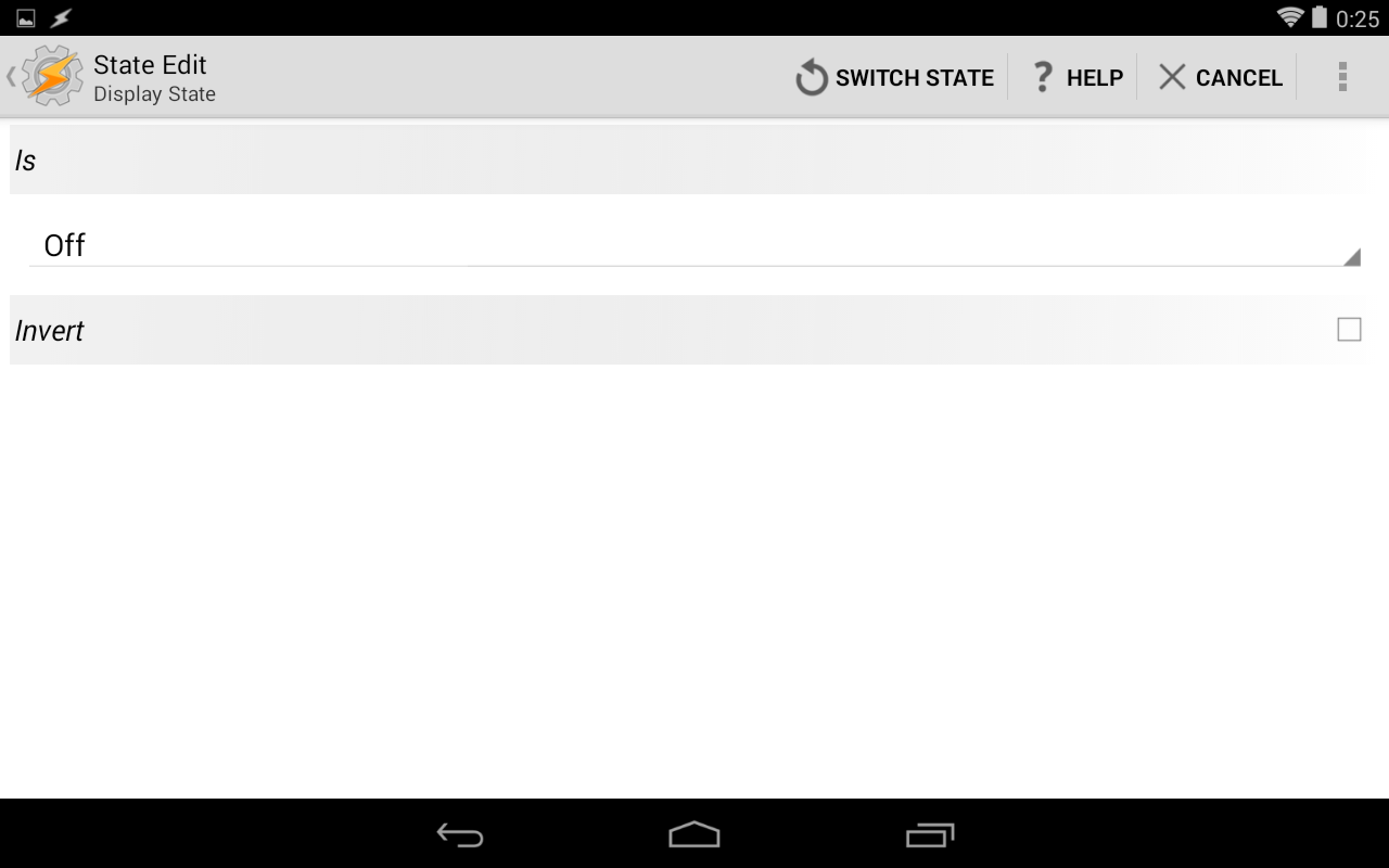 終了時のタスク設定は、最初の画面で「画面下部の+ボタンをタッチしてState」を選択、「Power」メニューから「Power」を選択して「Any」のまま「Invert」(反対=充電されていない状態)にチェックをつけます。